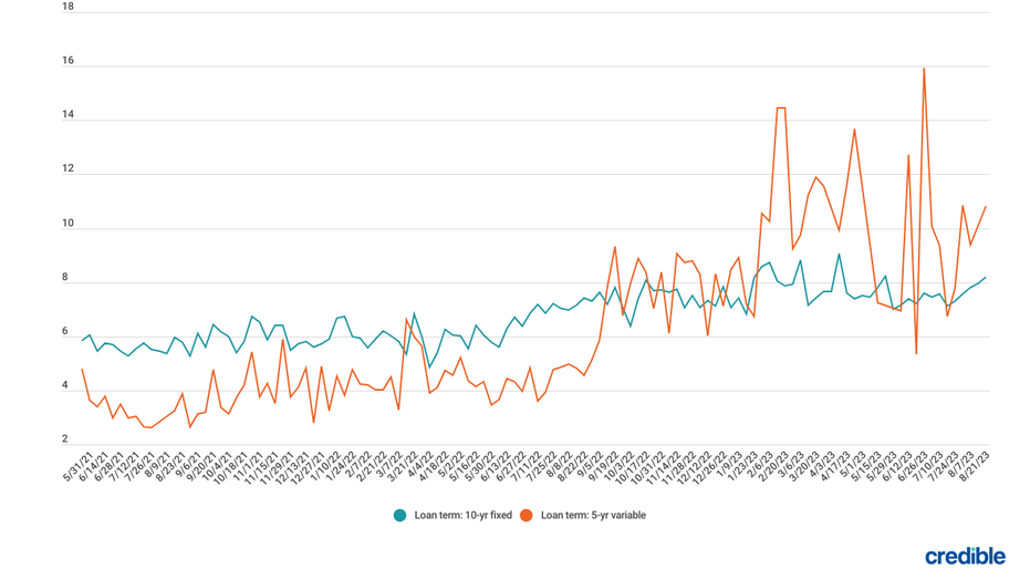 During the week of August 21, 2023, average private student loan rates rose for borrowers with credit scores of 720 or higher o used the Credible marketplace to take out 10-year fixed-rate loans and 5-year variable-rate loans.
