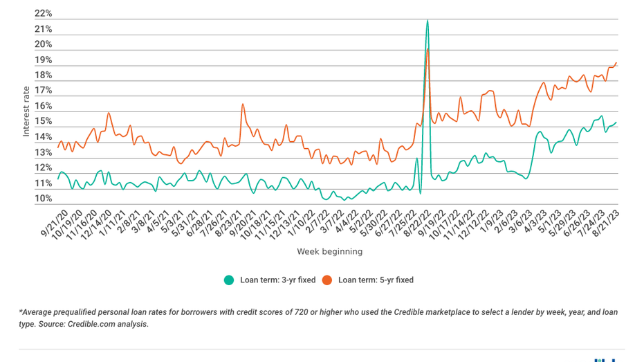 - Rates on 3-year personal loans averaged 22.99%, up from 22.37% in June.