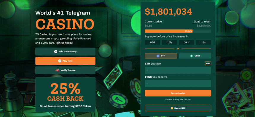 Friday, November 10, 2023 – Leading GambleFi presale TG Casino has hammered past $1.8M raised, as investors flock to $TGC token amid huge growth potential for Telegram-based crypto casinos.