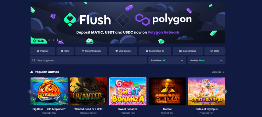 Flush Casino is just that, a casino. Unlike some other crypto gaming sites that have a sports betting section, Flush Casino does not offer this service. It focuses solely on casino games, including both RNG and live ones.