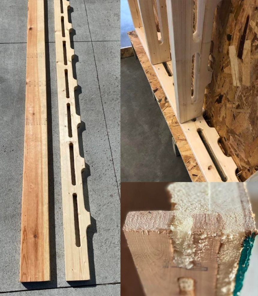 The basic premise of the product is to remove unneeded material from a traditional exterior stud, leaving slots in the stud. The slots can be filled with spray foam and blown-in insulation to fill the gaps, which raises the R-value of the stud and reduces thermal bridging, so the building can stay warmer in the winter and cooler in the summer.